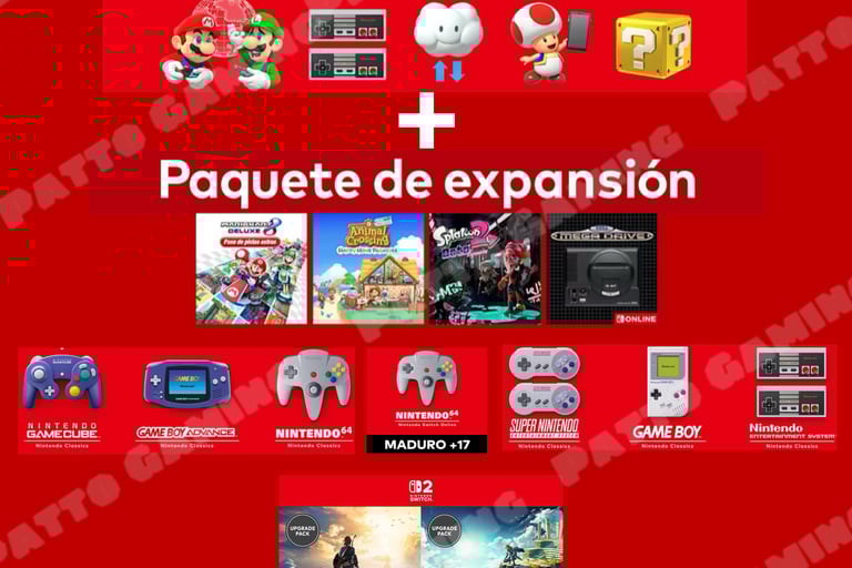 La suscripción con expansión te ofrece un año de Online, catálogo de videojuegos de NES, SNES, SEGA, Nintendo 64, Game Boy Clásico, Game Boy Advance, DLC de Mario kart, DLC de animal crossing y DLC de splatoon 2.